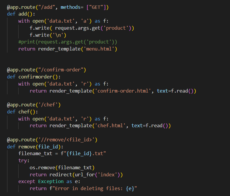 When clicking on the confirm order button you will get redirected to this page. I made sure that the content of the .txt file is shown. You can return to the menu if you want to add something else. If you click on confirm order you will be redirected to a chef screen. However the customer shouldn’t see that screen, but we didn’t know how to make them separate so our group just did it together. The chef will see the date and time. They also will see the .txt file. If the order is done the chef will click on finish and the order will be seen for the customer. I made sure that the .txt file is deleted when clicking on finish.